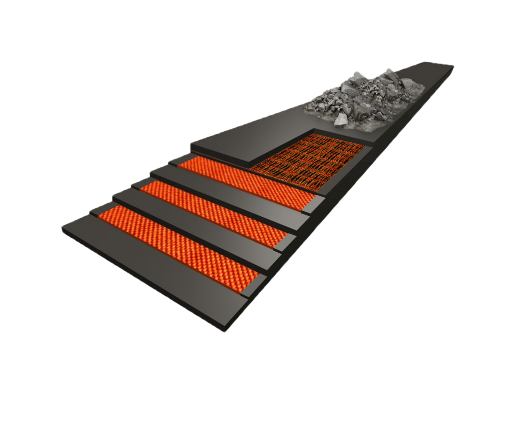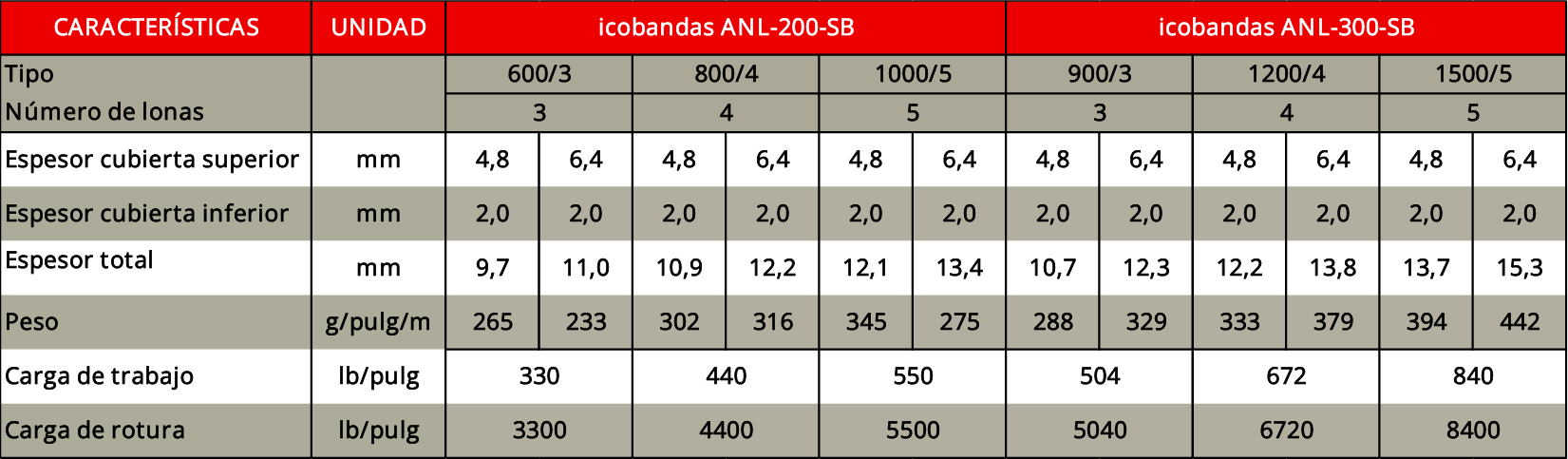 Para aplicaciones que requieran alta resistencia al impacto, al corte, al desgarro y a la abrasión se recomienda el uso de la icobandas ANL-SB con malla de acero (Steel Breaker). La malla de acero tiene cables muy flexibles, cuyas propiedades permiten integrarse perfectamente a la carcasa aportando resistencia sin aumentar rigidez, que generaría exigencias mayores en el diámetro de las poleas y en el ángulo de acanalamiento.