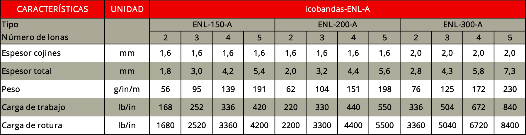 La icobandas ENL-A carece de caucho en la cubierta superior e inferior que normalmente no se requiere en transportadores verticales y al eliminarlo reduce el peso y el costo de la banda al mismo tiempo que es ideal para el trasporte de materiales con aceites, grasas, hidrocarburos o solventes que en bandas estándar a través de las perforaciones de los tornillos, genera un serio y progresivo deterioro en las propiedades físicas y mecánicas del caucho, con el consecuente daño de la banda.